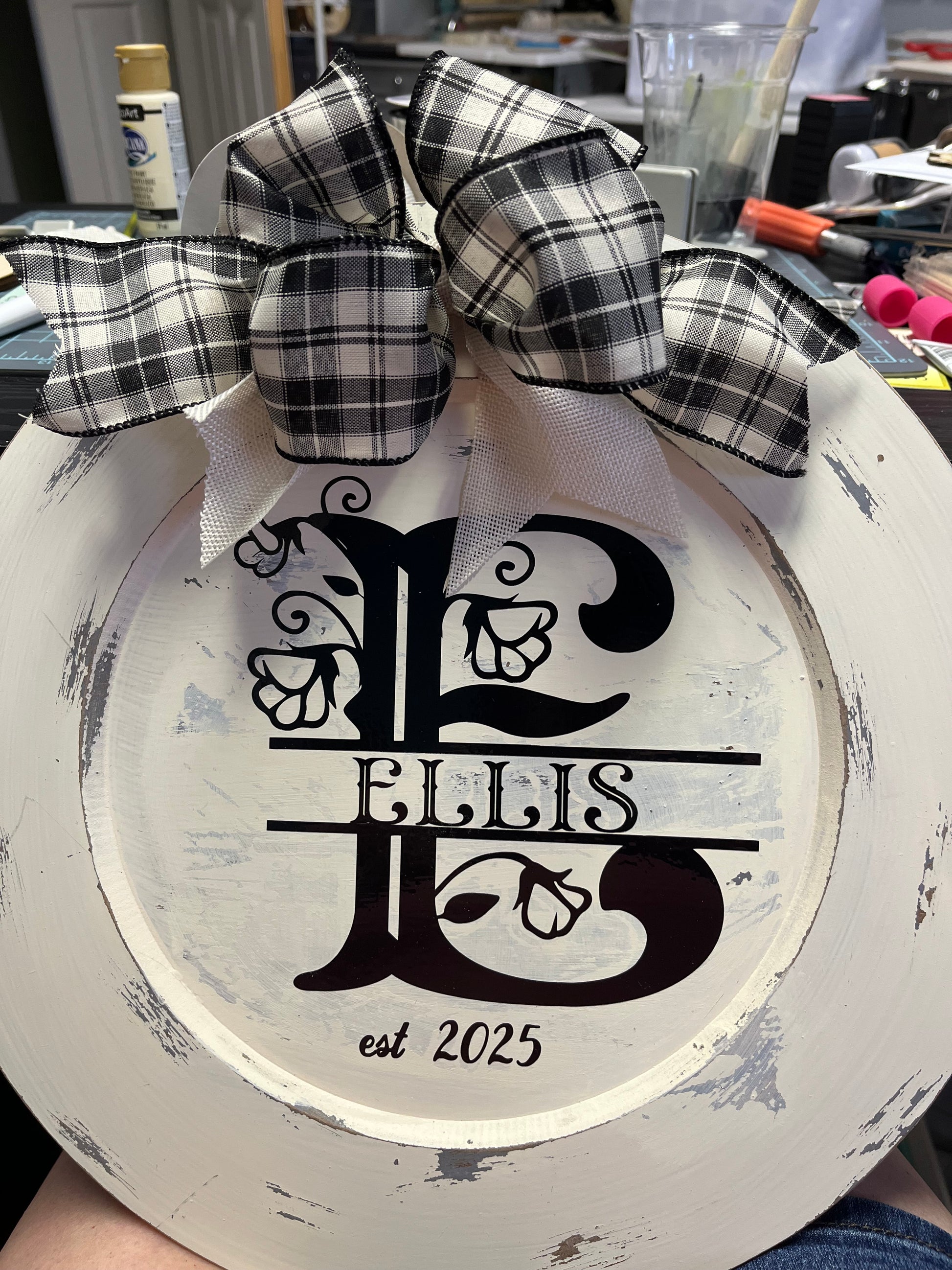 Create a unique statement piece with this personalized wall or door hanger, elegantly designed to fit on a charger plate. Customized with your chosen name and year, it offers a meaningful touch to your home décor or event setting. Crafted to showcase your details clearly, it blends style and personalization for a memorable accent. Ideal for commemorations, special occasions, or everyday charm.